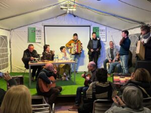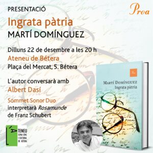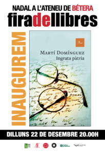 Anit vam viure el primer jorn de fira a l’Ateneu de Bétera, amb la presentació d’Ingrata pàtria de Martí Domínguez i l’actuació del Duo Sommet Sonor. L’envelat, amb els faldons nous, era ple i les estufes atenuaven el fred que ha vingut a instal·lar-se al festival de llibres. Martí és un segur de conversa, de fluïdesa, de saber explicar els detalls del llibre que es poden contar sense destapar les millors sorpreses. Ara, com en aquella novel·la americana d’una mort anunciada, ací ja deveu conèixer el final del protagonista principal, el metge, tres vegades doctor, rector de la universitat de València. Un homenatge senzill, és veritat, d’un homenot que en mereixeria cada dia. Es van acabar tots els llibres d’en Martí, que no en va quedar cap, així que l’objectiu es va acomplir amb escreix.