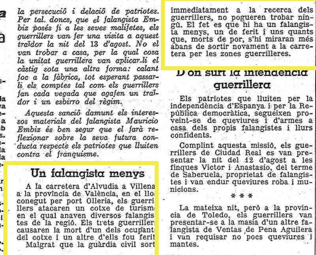 Però resulta que els papers impresos (i ara digitalitzats) diuen coses, i algunes poden lligar amb els records. El periòdic Lluita que editava el Partit Socialista Unificat de Catalunya (imprés a París), publicava el setembre de 1948 la notícia d’un atac dels maquis a un grup de falangistes al port de l’Olleria. Hi hagué, segons detallen, un mort i un ferit, que ben bé podria ser el que la Guàrdia Civil va dur a cal metge aquell d’Aielo de Malferit.