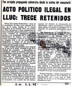No record ja com arribàrem a Felanitx. Però en aquells anys Nova Cançó era equivalent a lluita antifeixista, a combat mortal contra la putrefacció cultural del franquisme (l’equivalent a la lluita actual contra les brutors d’un Julio Iglesias o una Rocío Jurado, per posar-ne un exemple). Ajudar la promoció de la nostra cançó, per tant, era una les activitats més importants de la lluita d’aquell moment contra la dictadura. Quants de viatges no férem aquells anys ajudant en Marià Albero, na Maria del Mar Bonet, en Joan Manuel Serrat, en Quico Pi de la Serra, en…