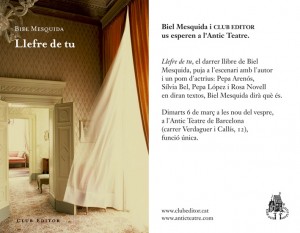 Llefre de tu a l’Antic Teatre de Barcelona el passat dia 6 de març a les 21 hores, dins les veus de Maria Bohigas, Pepa Arenós, Sílvia Bel, Pepa López i Rosa Novell va ser un espectacle a capella de bellesa, emoció, tendresa i generositat a voler amb un públic amador dels llibres i de les veus, antent i enfervoritzat, que va fruir seixanta minuts seguits en aquella catacumba, espai privilegiat, oasi, cripta, temple, lloc sagrat dedicat al culte de la literatura bella. Gràcies a tots, a tots, de bon de veres!!!!!