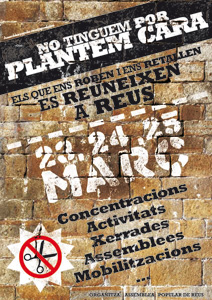 Per això l’Assemblea Popular convoca els col·lectius, organitzacion i assemblees del CAMP que lluiten contra les retallades socials i laborals, a que participin a la reunió preparatoria del proper 1 de març a les 19.30h de la tarda al local de la CGT de Reus (Raval Santa Anna 13, 2n). La convocatòria té la intencionalitat d’informar del programa del contracongrés, rebre aportacions noves i/o sugerències i el suport de totes vosaltres per fer-los l’existència ben difícil als qui ens privatitzen els nostres drets.