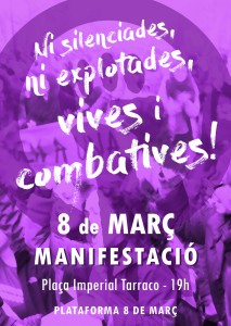 Avui a les 19h a la plaça Imperial Tarraco de Tarragona, es farà la manifestació del 8 de març del Camp, sota el lema “Ni silenciades ni expolotades, vives i combatives!” . Es important que tots els col·lectius del camp tinguem presència en la marxa, com a esquerra independentistes portarem pancarta de pals. La lectura del manifest unitàri anirà a càrrec d’una persona d’Arran Valls i una de l’Assemblea d’Educació, a banda hi haurà el manifest de les organitzacions feministes: L’hora Violeta i Cau de Llunes, després la coral del Casal Sageta de Foc cantara dues cançons.