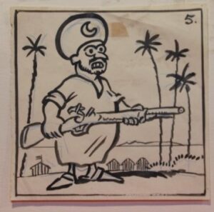 Tot i que no hem pogut comprovar-ho, el dibuix que presentem segurament es va publicar a L’Esquella de la Torratxa en un moment de conflicte bèl·lic al Rif (un tema molt tractat per Picarol). Es tracta d’una vinyeta que forma part, sembla, d’un conjunt de 9, on fa sàtira de la guerra amb les cabiles.