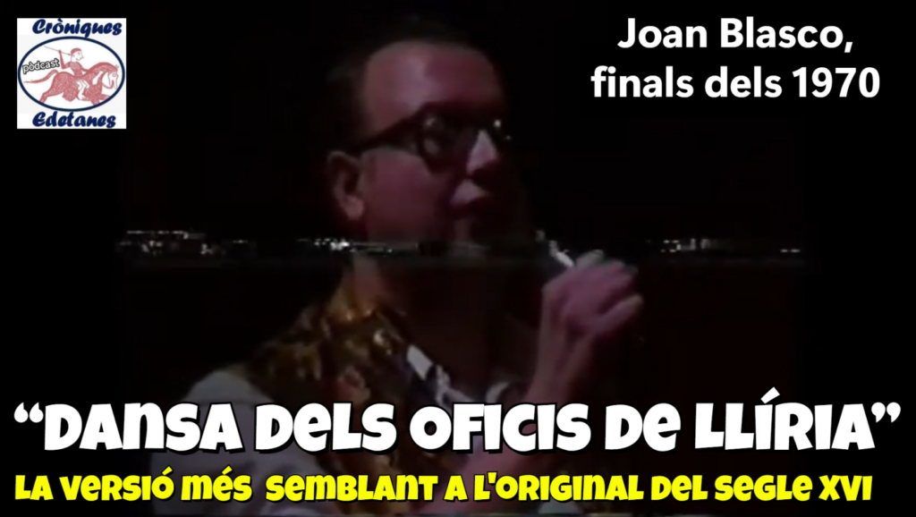 Gràcies a l’estimat amic (i formidable dolçainer) Ferran Navarro Jr., hem recuperat aquesta versió de 1977 de la “Dansa dels Oficis de Llíria”, interpretada pel gran mestre Joan Blasco, amb el tabaleter de l’Eliana Jordi Martínez, i el grup de dansaires de Torrent…