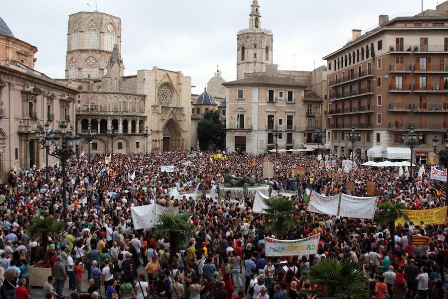 La tria de la plaça no ha estat casual. Des de fa uns mesos, aquest lloc s’ha convertit en punt de trobada per a tots aquells que reclamem una manera diferent d’entendre la política i la nostra condició de valencians. La plaça de la Mare de Déu ha estat un clam en favor de la llengua a les escoles i contra la supressió de les línies en valencià, un crit contra la corrupció de la classe dirigent, una batalla per TV3… però també un lloc per a recordar, cada dia tres, aquells que van perdre la vida en l’accident de metro més trist de la nostra història.