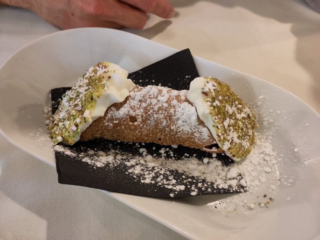 Sigui com sigui, ens quedem a dinar en un petit restaurant on ens serveixen un àpat pantagruèlic. A més, per postres no podem evitar de repetir els addictius canoli del país. És un menjar molt llaminer, molt i molt dolç. Caldrà fer règim quan tornem a Catalunya.