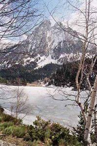 La fotografia és del 2002, durant un episodi de glaçades en què tot el llac era cobert d’un mantell blanc de gel, i les muntanyes fumejaven boires constants. (Aleshores, a l’entrada del Parc Natural s’hi podia arribar encara amb cotxe propi).