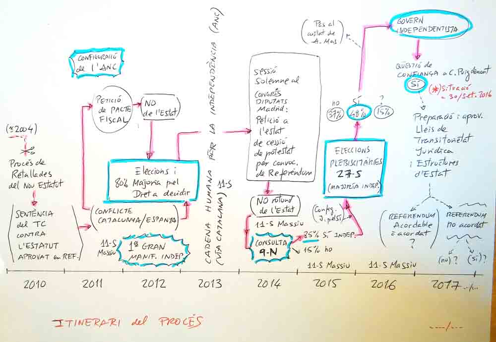 Després superada la moció de confiança al President Puigdemont, i de clarificat una mica més el full de ruta, és potser un bon moment per recapitular i veure en perspectiva l’evolució i la cronologia dels principals esdeveniments ocorreguts durant el procés independendista, …. en el què ja hi portem uns anyets esmerçats.