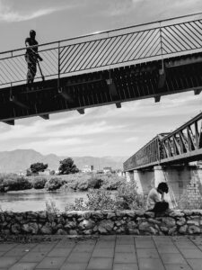 Una imatge que podria mostrar dues realitats oposades: mentre algú, inquiet, sembla vigilar si el segueixen, un altre es manté clavat, amb els ulls fixos en una pantalla; el de dalt corre veloç per la rampa i observa l’entorn; al de baix li són igual el riu i les muntanyes, i tot allò que passa. És evident que el gran està més despert; al jove, per contra, se’l veu com estabornit. Qui ascendeix arran de barana no té aturador; el que està assegut ni sent les rodes de qui gairebé ja l’avança. Al de dalt li toca l’aire, mentre que al de baix no se li veu la cara. El que es manté dret damunt del patinet pensa en el futur; l’assegut, en canvi, probablement en coses vanes. El més madur, en aquest cas, superarà amb èxit l’obstacle de tota pujada; el més petit, no ho sabem, però potser ho tindrà més magre.
