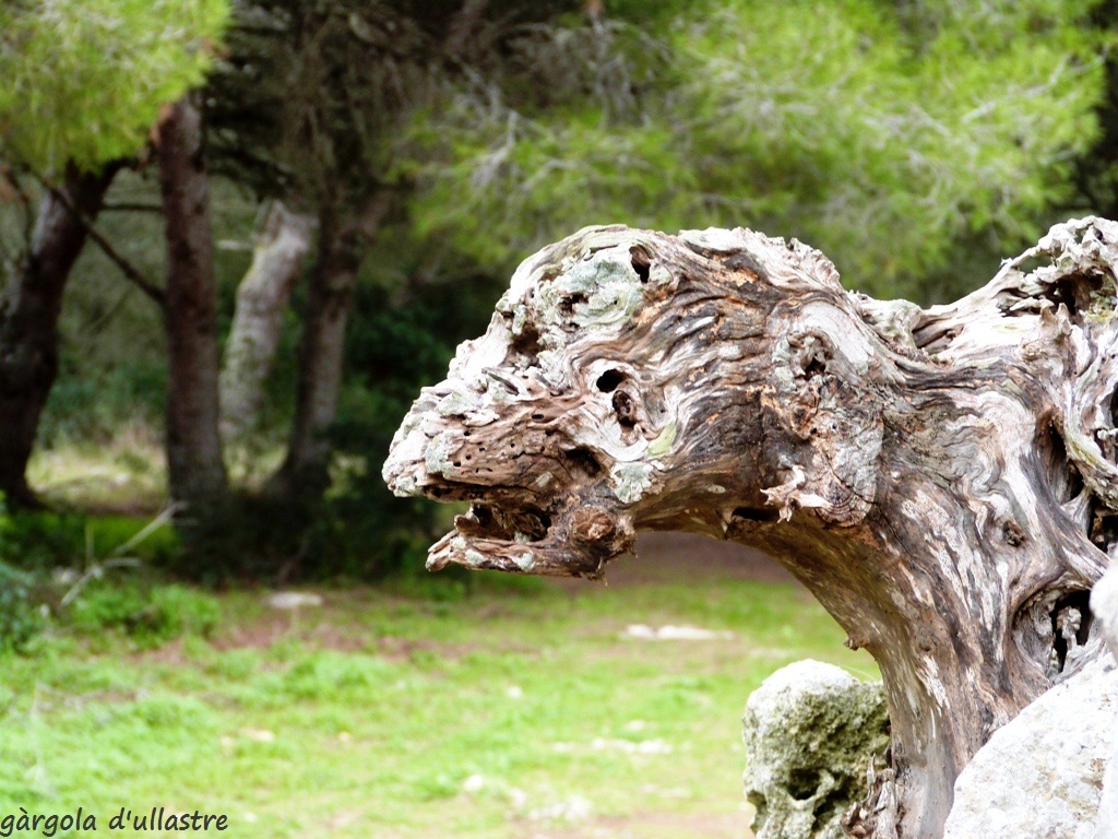 A poc a poc, una soca d’ullastre mort, s’acomiada de l’entorn satisfent, sembla ser, el capritx d’aparentar un ferotge animaló tipus pètries gàrgoles de catedrals i, és que ja ho deia Gaudí que, “tot surt del gran llibre de la Naturalesa”.