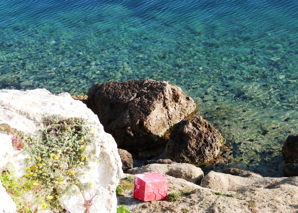 La transparència de l’aigua permet comptar, un per un, els eriçons que habiten el fons del mar i tanmateix, com una clatellada visual, la cubeta de plàstic permet pensar en la persona carallot habitant de l’exterior que l’ha perduda, se l’ha deixada o, en el pitjor dels supòsits s’ha desempallegat d’ella intencionadament fotent-la avall pel rocam del litoral.