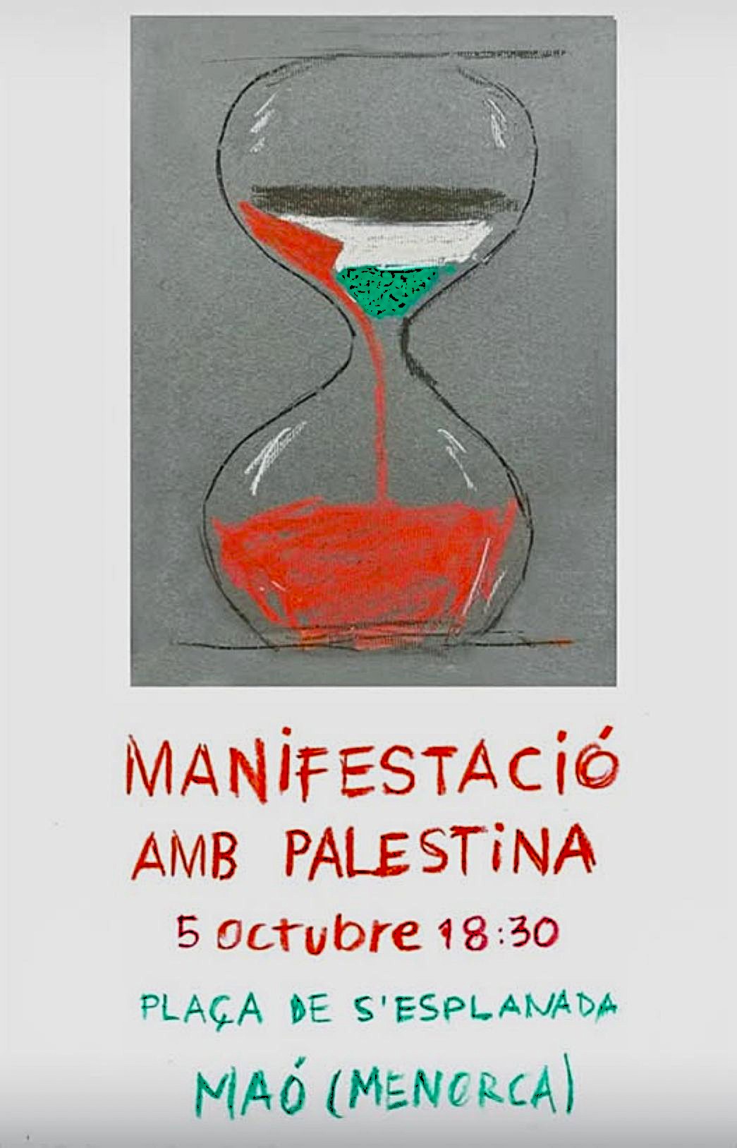 Corre per les xarxes, però com que ignoro si són locals o globals, aprofito l’apunt d’avui per transmetre que un cop més la figura d’un ancestral funcionament del rellotge d’arena, facilitant la creació gràfica d’actualitat, ahir feia saber l’hora i lloc de concentració per no aturar les manifestacions de solidaritat cap al genocidi que impunement està duent a terme el govern de l’estat d’Israel.