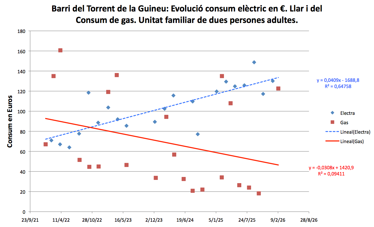 Comparativa entre la despesa elèctrica i la de gas en una llar estandar de dues persones adultes que viuen a Barcelona. Inclou les factures dels darrers 5 anys. En blau la línea de tendència del preu de l’electra. En roig la línea de tendència del preu del gas.