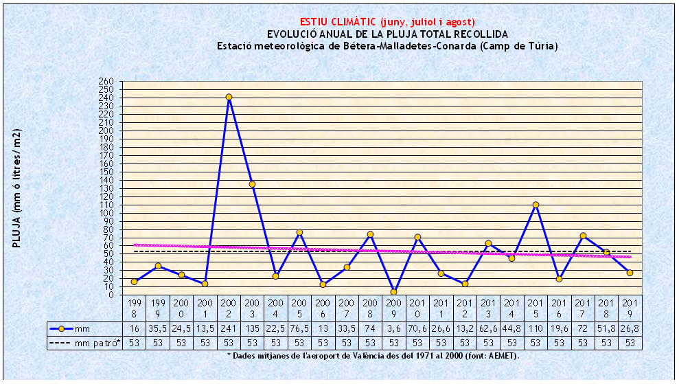 En efecte, les dades calculades del darrer estiu climàtic (trimestre en què la temperatura és la més alta de l’any) assenyalen una estació de mitjana més càlida del normal (agafe com a patró la mitjana de dades de la sèrie del 1971 al 2000 a l’aeroport de Manises, corregida per la diferència d’altitud entre observatoris), una pluja acumulada la meitat del que esperava (la que indica el patró citat abans) i una força del vent superior a la mitjana del meu observatori per aquest període (11 anys de dades), mantenint-se la component marítima com a majoritària, conseqüència de la predominança del règim de brises o marinades a prop del litoral.