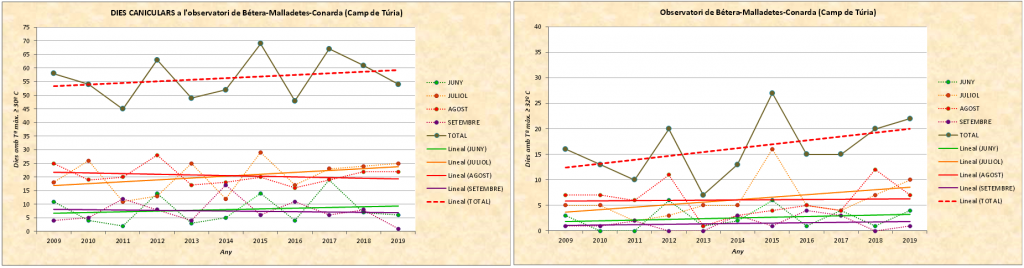 Climatòlegs valencians han trobat en els últims decennis una sèrie de canvis significatius en el nostre clima, que se citen en el llibre “Climes i temps del País Valencià “, editat per la Universitat d’Alacant en aquest 2019. Entre d’altres, un augment molt significatiu de la temperatura dels dies i nits calorosos, sobretot a partir de la dècada dels anys 80 del segle passat; així, en poc més de mig segle, s’ha duplicat el nombre de nits tropicals en observatoris oficials com el de la ciutat de València, on no hi hem de menystenir l’efecte d’illa de calor, produït per un excés de rajola i asfalt. Com a humil aportació d’aquest aficionat a la meteorologia, ací us deixe diverses gràfiques que he confegit amb les dades de què dispose, relatives a un indret situat al terme municipal de Bétera, comarca valenciana prelitoral del Camp de Túria: