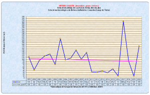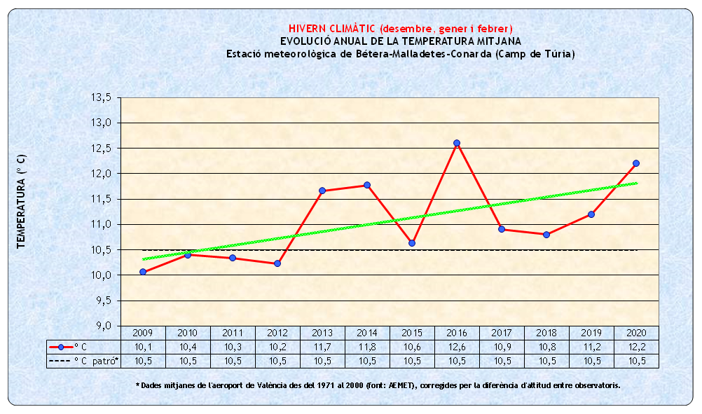 En graficar les dades anuals de l’Hivern climàtic, en base a l’històric de què dispose i que podeu veure ací, s’observa que, amb oscil·lacions de ± 1º C, la temperatura mitjana segueix una tendència ascendent (línia verda de la recta de regressió), que ara se situa al voltant d’1,3º C per damunt del patró triat (línia fosca discontínua: dades mitjanes de l’observatori de l’aeroport de Manises, sèrie 1971-2000, corregides per la diferència d’altura amb el meu observatori); mentre que la pluja total recollida, amb la lògica major irregularitat de les oscil·lacions, manté una evolució contrària (línia fúcsia de la recta de regressió), que ara suposa una pèrdua de l’ordre de 30 mm respecte del patró (línia fosca discontínua: mitjana de la sèrie i l’observatori citats abans). Ens trobem, doncs, en una situació semblant a la de l’any passat quant a temperatura (hem pujat 0,1º C), però lleugerament millor quant a pluja (hem baixat la minva en uns 10 mm), gràcies a les pluges que ens va portar l’episodi del “Glòria” en gener.