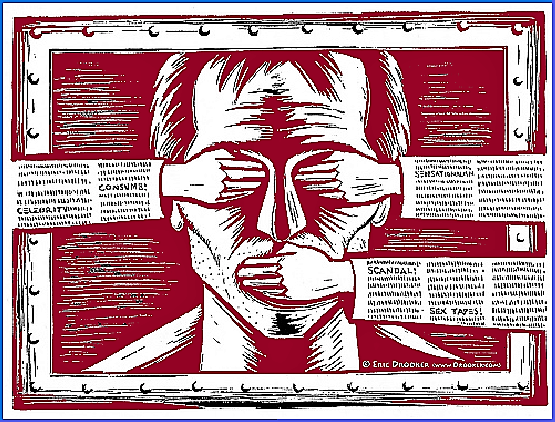 1. Tapeu o negueu la premissa major. Es tracta de que ningú no escolte res d’allò moralment dolent que voleu amagar, que no en veja res, que no se’n parle res. Independentment del que sapigueu, no ho ventileu ni hi discutiu, sobretot si sou una figura pública, un informador de notícies, etc. Allò del que no s’ha informat, no existeix i mai no hi haureu de tractar.