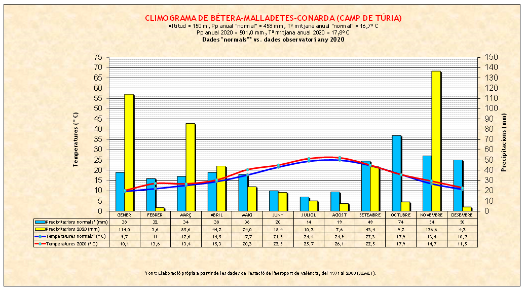 La climatologia és la ciència que estudia els meteors atmosfèrics i la seua variabilitat a llarg termini en les diferents àrees geogràfiques; mentre que la meteorologia ho fa a curt o mitjà termini i hi forneix les dades que permetran a la primera la caracterització climàtica de l’indret de mesura; una anàlisi estadística que aplega un mínim establit de 30 anys de dades. En el cas del meu observatori d’aficionat, situat al SE del Camp de Túria, tan sols dispose d’una dotzena d’anys pel que fa a la temperatura i el vent, i vint-i-dos anys pel que fa a la pluja. Científicament parlant, doncs, encara no puc afirmar res amb seguretat pel que fa al clima ni a la seua evolució a l’àrea propera al meu punt de mesura.