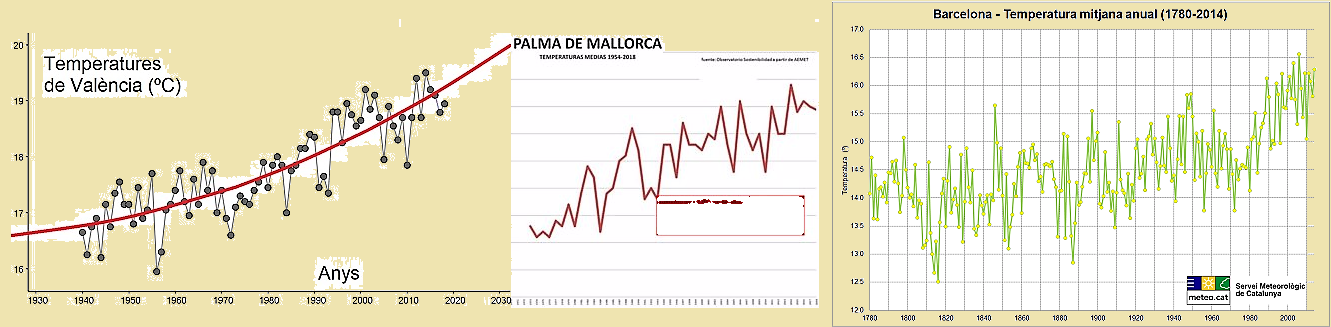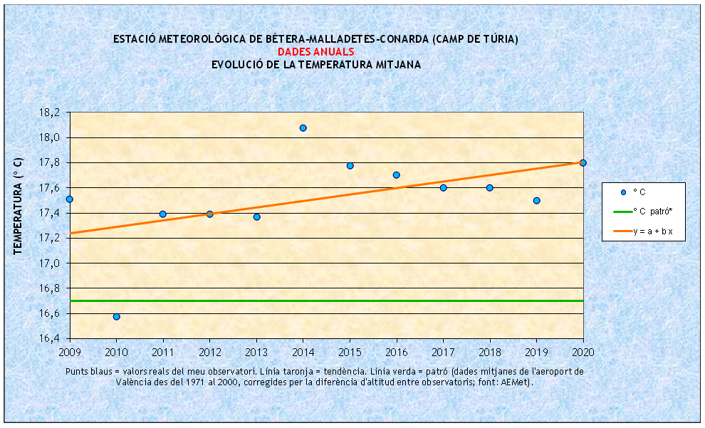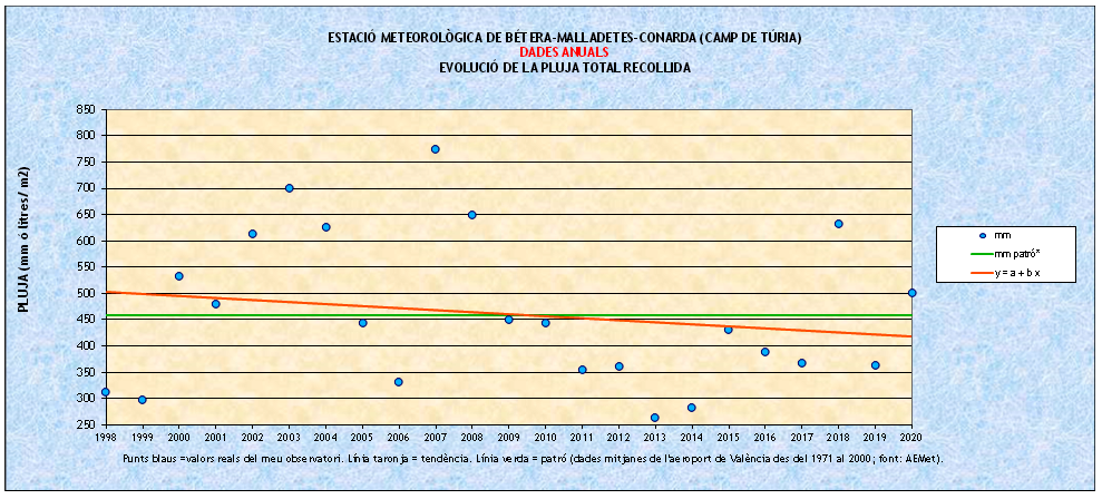 El que sí puc afirmar en aquest cas, i considere que és el millor resum meteorològic anual que puc donar al lector en general, és la tendència que mostren les meues dades, que és coherent amb l’era del canvi climàtic antropogènic en què ens trobem, estudiada i determinada pel gruix dels científics que hi entenen a escala mundial. Perquè mostra un escalfament pel que fa a la temperatura mitjana anual i una reducció de la precipitació anual; exactament un augment d’uns 0,6º C en els darrers 12 anys (uns +1,1º C respecte del patró) i una disminució d’uns 80 litres/m2 en els darrers 22 anys (uns -40 litres/m2 respecte del patró). Ho podeu veure en les rectes de regressió de les gràfiques adjuntes.