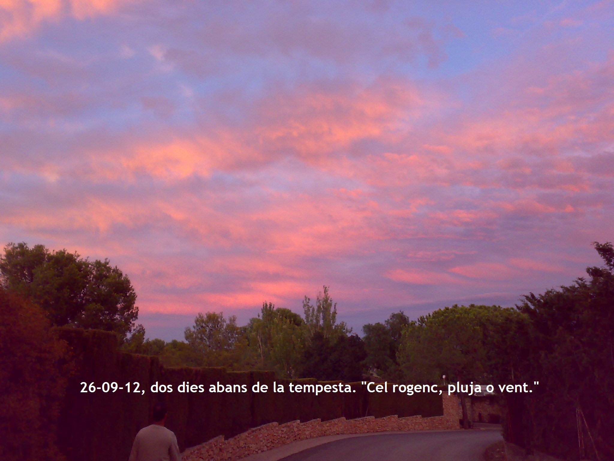 Þ Valor màxim diari observat: El trobem el 28 de setembre amb 123 litres/ m2, seguit de lluny pel 21 d’octubre amb 23 litres/ m2 i el 16 de gener amb 21. Ja sabeu que el començament de la tardor és força propens a tempestes fortes i aiguats importants, en conjuminar-se entrades d’aire fred en altura amb la mar mediterrània encara força calenta de l’estiu. Recorde amb emoció i esverament alhora aquell divendres 28 de setembre: fou un dia de fort temporal de vent in crescendo, seguit d’una pluja torrencial d’una hora. El vent fort sostingut del NE es mantingué tot el dia, des de les 6 del matí fins a la mitjanit, sent especialment fort entre les 4 i les 8 de la vesprada, amb bufarades màximes entre 50 i 70 Km/ h. Després de les 8, de sobte, el vent disminuí d’intensitat, canvià de direcció i una mitja hora més tard començà a ploure intensament durant un parell d’hores (s’arribaren a assolir els 190 litres/ hora), recollint-se en l’hora central de l’episodi, entre les 9 i les 10 de la nit, uns 100 litres/ m2. Durant aquest període de pluja, el vent anà canviant de direcció: primer de NE a S, després a SW i finalment a NW. Cal no oblidar que en aquest tipus de temporals tan extremats és possible que s’esdevinguen fenòmens violents força localitzats per davall dels núvols de tempesta més actius, com els tornados (succió intensa cap amunt) o els esclafits (fortes ratxes de vent descendent). De fet, al dia següent pel matí, a uns 250 metres de casa n’hi havia un pi enorme caigut sobre l’asfalt i, més endavant, una tanca d’obra gairebé enrunada, que barraven el pas als vehicles.
