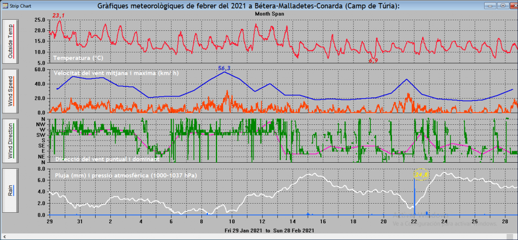 Si voleu ampliar-ne dades, ací us deixe un quadre-resum dels valors mitjans (temperatura i vent) o acumulats (pluja) que he registrat al meu observatori d’aficionat durant el darrer febrer, així com les gràfiques del meteors més significatius.