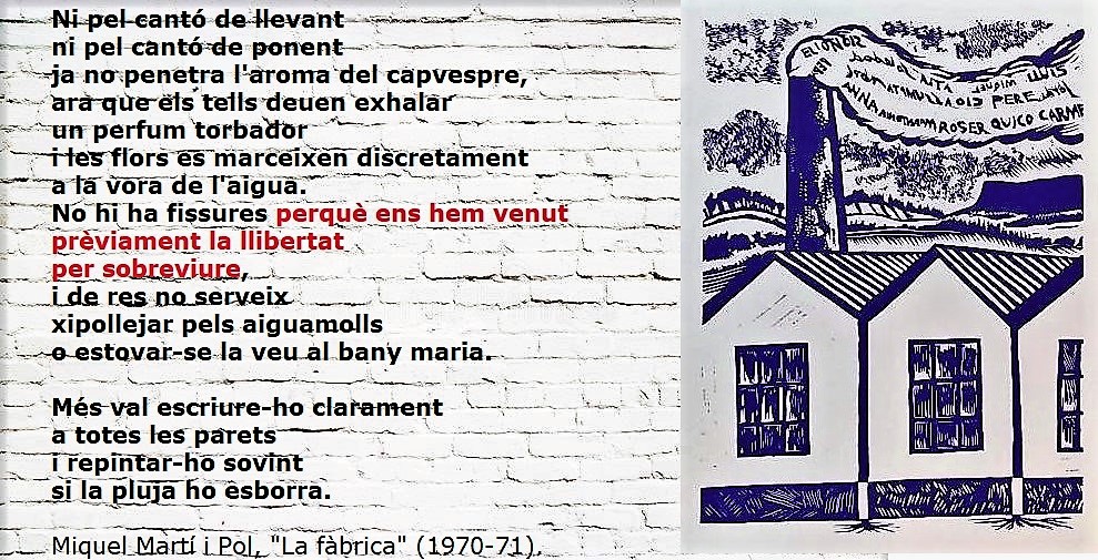 Què ha estat per a mi la feina? L’alarma que sona insistent al rellotge –perquè t’alces del llit ben dematí–, la necessitat de portar cotxe, la fressa i la fredor de les màquines, l’imperi del rendiment econòmic i productiu per sobre de l’obra ben feta –el “curt-terminisme” del guany malaltís–, el client que ha de restar sempre satisfet –malgrat que li hàgem de mentir–, l’obsessió per la novetat constant –davant la competència ferotge d’aquesta llei de la selva capitalista— que massa vegades porta a compondre productes més dolents –potser més aparents, més “adobats”, però menys autèntics, menys duradors, de menor qualitat–, la submissió al poder inclement d’altri –els propietaris de la indústria i els seus gestors, una bona mostra de psicòpates/ nacissistes–, la manca d’humanitat, de sentiments autèntics –que tenen massa poc espai a les empreses–, la competència deslleial entre companys per salvar el lloc de feina, la ciència i la tècnica al servei dels interessos dels propietaris, que cada vegada ens espremen més, perquè disposen de mètodes més sofisticats, i ens deixen menys temps per a nosaltres… Però també la complaença per haver arribat a la fi d’alguns projectes proposats i sobretot la sort d’haver compartit un bon grapat de bones estones amb les companyes de feina, de qui tinc un record inesborrable de treball en equip, de bona entesa, d’estimació sincera.