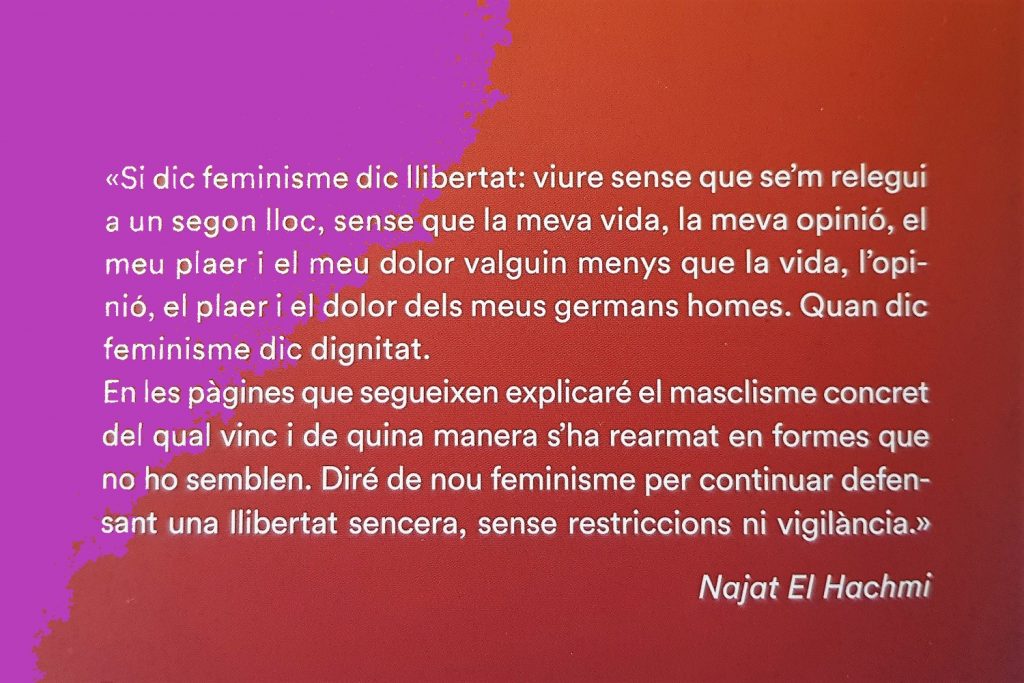 Des de la ràbia que l’ha empesa a escriure aquest assaig que ara us presente –i que ha estat un merescut èxit de vendes–, Najat El Hachmi hi raona amb to enèrgic sobre el feminisme i la identitat a les societats musulmanes, tant d’origen com d’acollida, confegint el que podem qualificar de, com diu a la portada, “un manifest valent i necessari”. L’obra ens mostra el coratge de l’autora per a enfrontar-se a l’opressió, la violència i la injustícia en què sobreviuen les dones a les societats islàmiques, on les interpretacions de l’Alcorà –sobretot les més radicals o fonamentalistes– castiguen cruelment les dones que gosen oposar-se a les lleis que les menystenen –“la llei del pare”, en la descripció ben encertada que hi empra al llibre. Ens hi confessa que l’escriptura ha estat com una teràpia per a no ofegar-se del tot, dins d’aquest masclisme abassegador que l’ha perseguida des que tenia ús de raó.