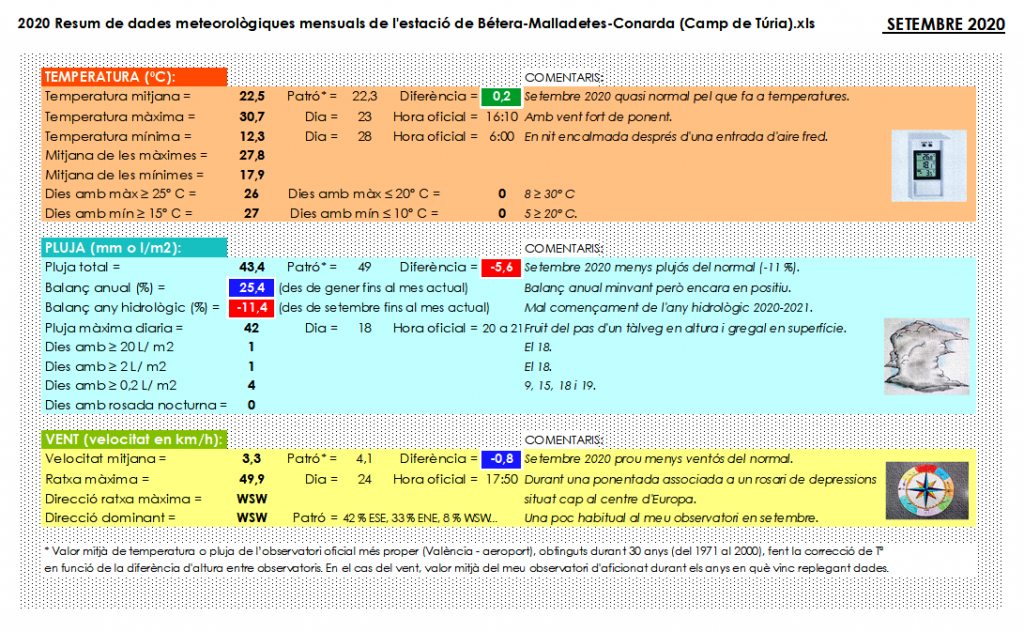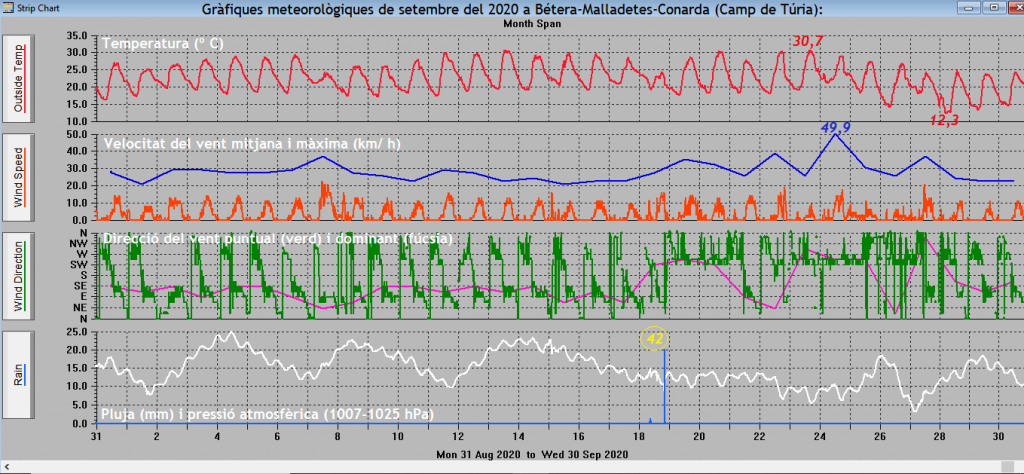 Passant a resumir les dades meteorològiques concretes d’aquest setembre del 2020, tal com han quedat registrades al meu observatori d’aficionat, situat a la banda més alta del terme de Bétera (Camp de Túria), a un racó de la partida de les Malladetes, anomenat la Conarda, tenim el següent: