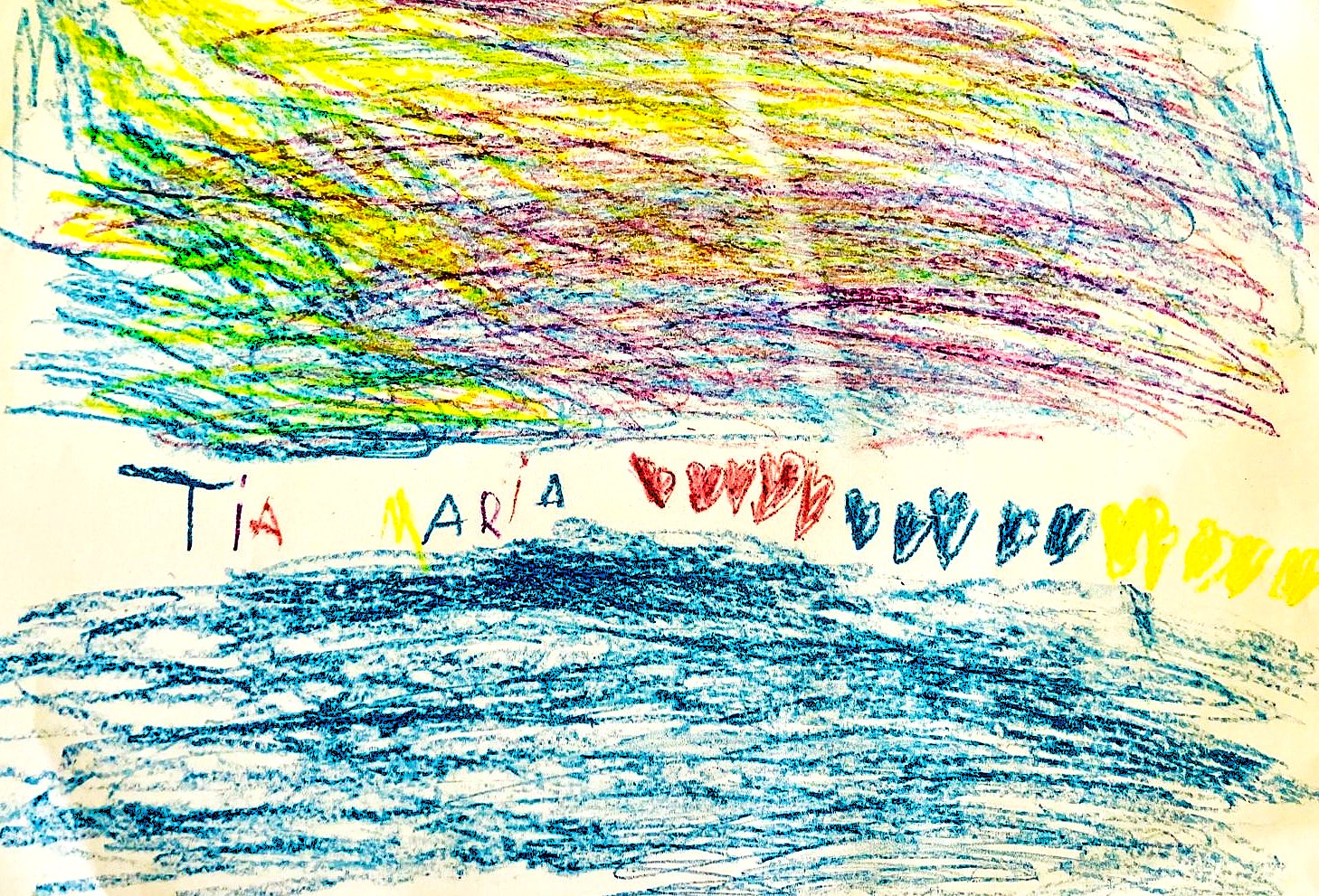El preceptor menor, però, era al cementiri amb un objectiu molt concret: lliurar a la tia Maria un dibuix fet expressament per a ella i per dir-li, a través d’ell, que la seguim estimant. Es tracta de la representació d’una posta de sol a la mar solcada per 15 cors, cinc de vermells, cinc de blaus i cinc de grocs, dedicats a ella.