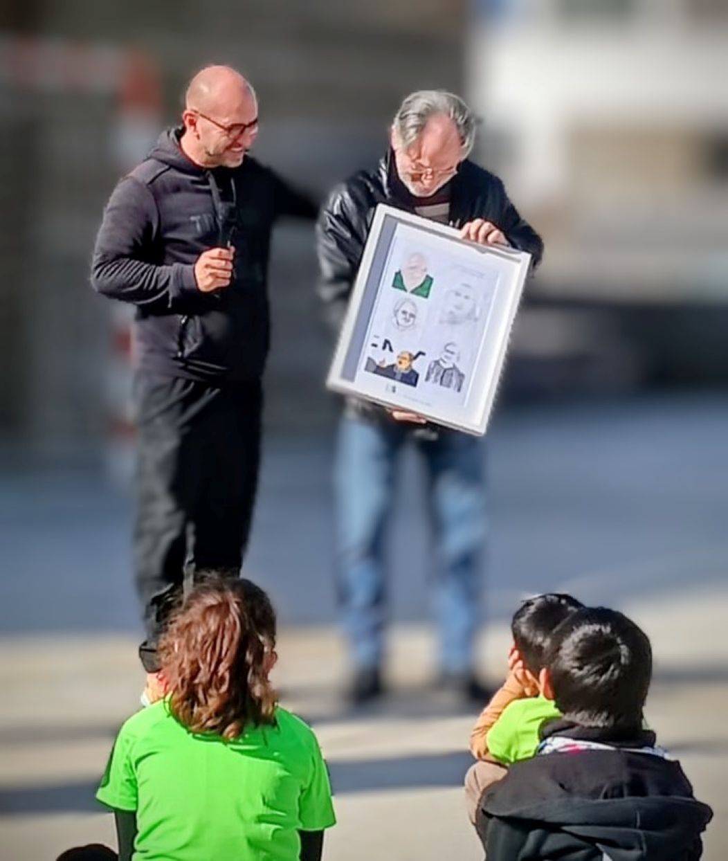 Però just entrar a l’escola, el seu director ens va dir als que en nom de Can Gazà érem allà que els alumnes havien cercat informació de què feim al centre, a qui tractam i qui era i què havia fet en Jaume Santandreu. I que, a més d’escollir cinc dibuixos dels molts que feren sobre instantànies d’en Jaume per formar-ne un quadre commemoratiu, havien preparat un parlament sobre la seva tasca amb els exclosos i el que havia anat dient a l‘escola al llarg de desset anys en el Dia Escolar contra la No-violència i la Pau.