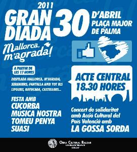 Demà dissabte, dia 30, l’Obra Cultural celebrarà a Palma, a la plaça Major i a partir de les cinc de l’horabaixa, l’èxit clamorós que ha obtingut la seva campanya “Mallorca, m’agrada!”. Durant quatre mesos, el crit deixondidor de l’autoestima dels mallorquins que és la campanya, ha voltat per tota l’illa deixant-hi petjada. Fins ara, s’han fet més de 30 lip-dups i n’hi ha una desena més en cartera. En aquests enregistraments, que mostren a bastament la vitalitat de les nostres viles, hi han participat unes 16.000 persones i més de 80.000 els han vist a través del web www.mallorcamagrada.cat.