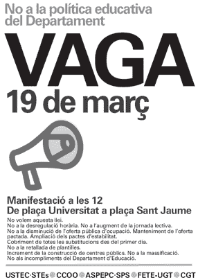 El meu company Xavier Diez ( http://www.sindicat.net/n.php?n=9589 ) escriu: “el 19 de març els docents aturaran les classes i sortiran al carrer, no pas per demanar més diners, ni treballar menys, ni conspirar contra cap govern. Sinó per defensar un model d’escola, que alhora ho és també de societat; una institució controlada per mecanismes democràtics, pilar de l’estat del benestar i abocada a tractar d’atenuar les diferències socials generades pel sistema econòmic.”