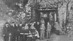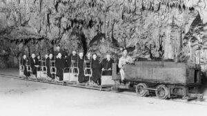 instal·lació els llavors emperadors d’Àustria-Hongria Francesc Josep i Elisabet (presents a la zona per inaugurar l’estratègica línia de ferrocarril entre Viena i Trieste) i foren habilitades unes cadires de mà per transportar-los, a falta d’un mitjà més còmode. Calia una solució més pràctica. Dit i fet: el 16 de juny de 1872 es posà en marxa un servei de faetons (cotxes de quatre places) empesos per empleats i, el més important, guiats sobre rails de 620 mm, una amplada òptima per a línies com la present, que no es diferenciava gaire dels trens miners (a dalt; a la imatge no es percep bé però el rètol de l’entrada és trilingüe eslovè-alemany-italià). La línia feia 1.534 metres de longitud i unia en un principi la concreció calcària coneguda com a Priznica (‘púlpit’) i el peu de Velika gora (‘muntanya gran’). Les obres duraren tres mesos i, sens dubte, el fet que l’interior de la cova és pràcticament horitzontal va facilitar en gran mesura els treballs de construcció.