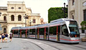 Com tantes altres ciutats, Sevilla va veure circular tramvies des del segle XIX (1887) fins al 1960 (1965 si comptem una línia suburbana). La reintroducció d’aquest mitjà de transport es començà a considerar el 2004 i poc temps després, l’octubre de 2007, s’inaugurà una primera i curtíssima línia de 4 parades que discorre pel centre de la ciutat. El 2011 i el 2024 la línia s’ampliaria a 4 parades més. Al principi el servei era prestat per unitats Urbos 2, cedits pel metro de Sevilla mentre aquest no concloïa les interminables obres (la història del metro de Sevilla és llarga i sucosa, però avui no toca). Aquestes unitats son de les tradicionals, amb catenària aèria, circumstància que aviat va tenir conseqüencies: a més de les queixes d’un sector de la ciutat per raons estètiques (ja són ganes de queixar-se), els cables del tramvia interferien amb el recorregut de les processons de Setmana Santa, el que obligava, una vegada l’any i durant un mes, a retirar-los perquè els passos poguessin passar sense conseqüències no desitjades. El problema es solucionà pocs anys després, introduint els nous models Urbos 3 (a dalt), dotats d’un sistema que els permet “carregar piles” durant els 20 segons que romanen a la parada.