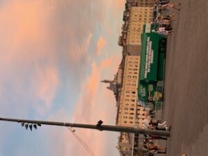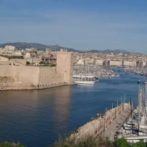 venedors i músics ambulants, activitats lúdiques o socials i, en determinades hores, parades de fruites, verdures o peix fresc, que atrau les gavines de la zona. Es tracta realment d’una mena de plaça de Catalunya barcelonina, amb la seva estació de metro un accés de la qual es troba a ben escassos metres de l’aigua. Al costat de la boca, una enorme placa al terra recorda que aquí es fundà la ciutat el 600 abans de Crist i des d’on, segons s’afirma amb una certa exageració, irradià la civilització a tot Occident. El Vieux-Port també és ideal per avistar molts dels motius d’interès turístic de la ciutat: la Mairie, és a dir l’Ajuntament, prop del mar, el Fort Saint Jean, seu del MUCEM (que després veurem), el Fort Saint Nicolas, la Catedral o, molt més lluny i elevada, el santuari de Notre Dame de la Garde (a dalt), potser l’edifici més emblemàtic d’una ciutat que no té cap Torre Eiffel, Sagrada Família o Estatua de la Llibertat per a identificar-la sense dubtes.