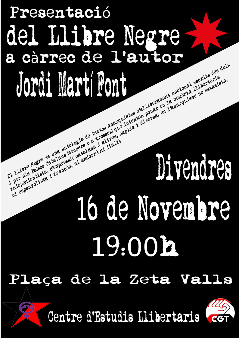 Dins dels actes de presentació i inauguració de la nova seu de la CGT de l’Alt Camp i la Conca, a Valls, divendres 16 de novembre, a les 19.30h, presentarem el primer volum del #llibrenegre a Valls.