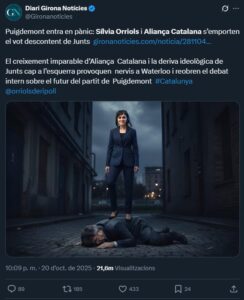 El 20 d’octubre, per acompanyar un text propagandístic del Bocs català, publicava una imatge creada per IA (que mai voldrà dir res que tingu9i a veure amb la paraula intel·ligència) que mostrava un carreró fosc on Carles Puigdemont es trobava de bocaterrosa, com si fos mort, i damunt seu l’Orriols mirava fixament a càmera somrient.