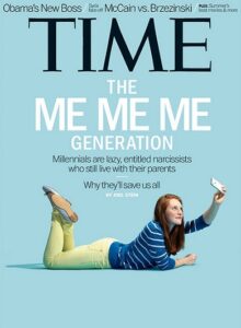 - Els millennials (1981-1996) són els fills de la generació del ‘baby-boom’. Inicialment se’ls va batejar com a generació Y, perquè van arribar després de la X, però han acabat rebent el nom de “millennials” perquè són la primera generació que va arribar a la majoria d’edat en el nou mil·lenni.. Durant la joventut van viure les guerres de l’Afganistan i l’Iraq, i la majoria van entrar a la vida laboral en plena recessió econòmica, fruit de la crisi de 2008. També varen viure les revoltes al voltant de 2011, com la Primavera Àrab, l’Occupy Wall Street o el 15-M. És la primera generació que lliga a través d’aplicacions i sovint se’ls ha acusat de ser materialistes, narcisistes i d’estar obsessionats amb la fama. La mala premsa dels millennials es va fer evident el maig de 2013, quan la revista “Time” els va dedicar una portada amb el títol ‘The me me me generation’ i una noia fent-se una selfie.