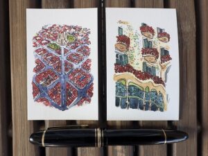 L’endemà de sentir la notícia vaig anar a veure aquella meravella de la tecnologia (*) i, francament, em va caure l’ànima als peus. L’aparell que tenim a Barcelona subministra a cada usuari que hi introdueix un euro una postal d’un repertori de sis. Un tria que, com acabo de dir, es fa al’atzar del que disposi la màquina entre sis imatges dibuixades que fan referència a elements arquitectònics o urbanístics barcelonins.