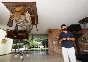 Però tornem a l’elegància minimalista del Mies van der Rohe. L’artista i arquitecte Xevi Bayona (Olot, 1982), amb un currículum que fa pensar que està a la cresta de l’onada, fa uns cinc anys va començar a idear la instal·lació artística que ahir va ser inaugurada, La padrina i les pertinences de la domesticitat. Bayona ha traslladat els mobles i objectes de casa de la seva padrina al pavelló. Amb una peculiaritat: els ha situat al sostre. Espectacular.