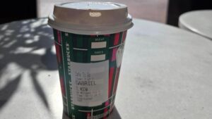 Es va posar a la cua i quan va ser el seu torn va demanar un Mocha gran. Com que pagava amb diners que no eren seus quan li van demanar el nom va dir ‘Gabriel’. Després va anar a seure, mentre preparaven la comanda. La taula era rodona, davant seu una cadira sense ocupar. Va guardar la cartera a la butxaca de l’infern buida perquè quan sortia de missió no portava ni mòbil ni documentació. Es va sentir observat. Un dels cambrers se’l mirava, va esquivar aquells ulls, una dona va agafar un got vermell i li va portar: “Gabriel? T’han estat cridant i no has fet cas. Era darrere teu a la cua…” A l’altra mà portava un got idèntic del qual sortia una olor perfumada de cafè i xocolata. Els mateixos gustos. La va convidar a seure. A l’etiqueta estava escrit ‘Maria’. Ella se’l va mirar somrient: ‘Què m’expliques, Gabriel?’ Ell li va tornar el somrís.