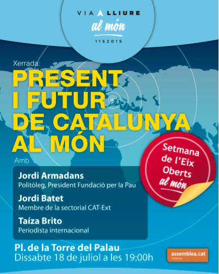 “Present i futur de Catalunya al món” és el tema de la xerrada organitzat per l’Assemblea Nacional Catalana (ANC), aquest dissabte, 18 de juliol a Terrassa, en la que una servidora tindrà l’honor de participar-hi.