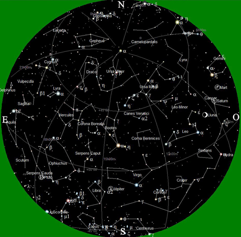 La imatge representa un mapa del cel nocturn del dia 1 de juny de 2006, a les 23:30 hores (hora oficial), que pot ser utilitzat per a l’observació. Només cal sostindre’l dalt del cap amb la part inferior en direcció al Sud (S). Així tindreu el Nord (N) a la vostra esquena en la carta, l’Est (E) es trobarà a l’esquerra i l’Oest (O) a la dreta. Aleshores veureu com les estrelles del mapa es corresponen amb les del cel. Aquest planisferi també pot servir-vos durant tot el mes. Només caldrà restar 4 minuts per dia de l’hora d’observació indicada. Així aquesta carta serà correcta igualment per al dia 15 a les 22:30 hores i per al dia 30 a les 21:30 hores. Existeix una versió en més alta resolució.