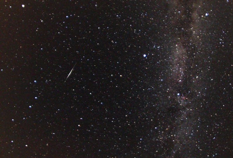 Foto d’una perseida del 12 d’agost 2013 a les 2 h (Temps Local). Es veu la Via Làctia davant de la Corona boreal. Foto obtinguda per Joanma Bullón amb l’ajuda d’Emilio Badimón i Ángela del Castillo (Equip de COSMOFISICA) des del CAAT (Centre Astronòmic de l’Alt Túria) a Aras de los Olmos (els Serrans). Punxeu sobre ella per veure-la més gran.