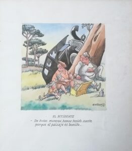 Pel que fa al dibuix que presentem, L’accident, es posterior a la Guerra del 36, com es pot veure en la llengua del text. En aquella època publicà a Destino, al diari esportiu El Mundo Deportivo, a El Correo Catalán, on feia un acudit diari, a més de crear El Once, amb el que va voler reeditar l’èxit del Xut! .