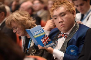 Un congresista del Partido Conservador lee un panfleto sobre el Brexit (foto de Oli Scarff/AFP publicada en El Mundo)