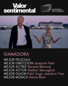 Valor sentimental, de Joachim Trier, va guanyar 8 (vuit!) premis EFA del Cinema Europeu (Millor Pel·lícula, Millor Direcció, Millor Actriu –Renate Reinsve-, Millor Actor –Stellan Skarsgård-, Millor Guió i Millor Música), dijous que ve (22 de gener) segurament arreplegarà un munt de nominacions als Oscar, recordem que ja obtenir 8 nominacions als Globus d’Or -de les quals en resultà triomfant Stellan Skarsgård , com a Millor Actor-, sense oblidar (sobretot) que el maig ja va guanyar el Grand Prix del Festival de Canes, guardó amb què va començar l’extraordinari reguitzell de premis i nominacions pertot arreu.