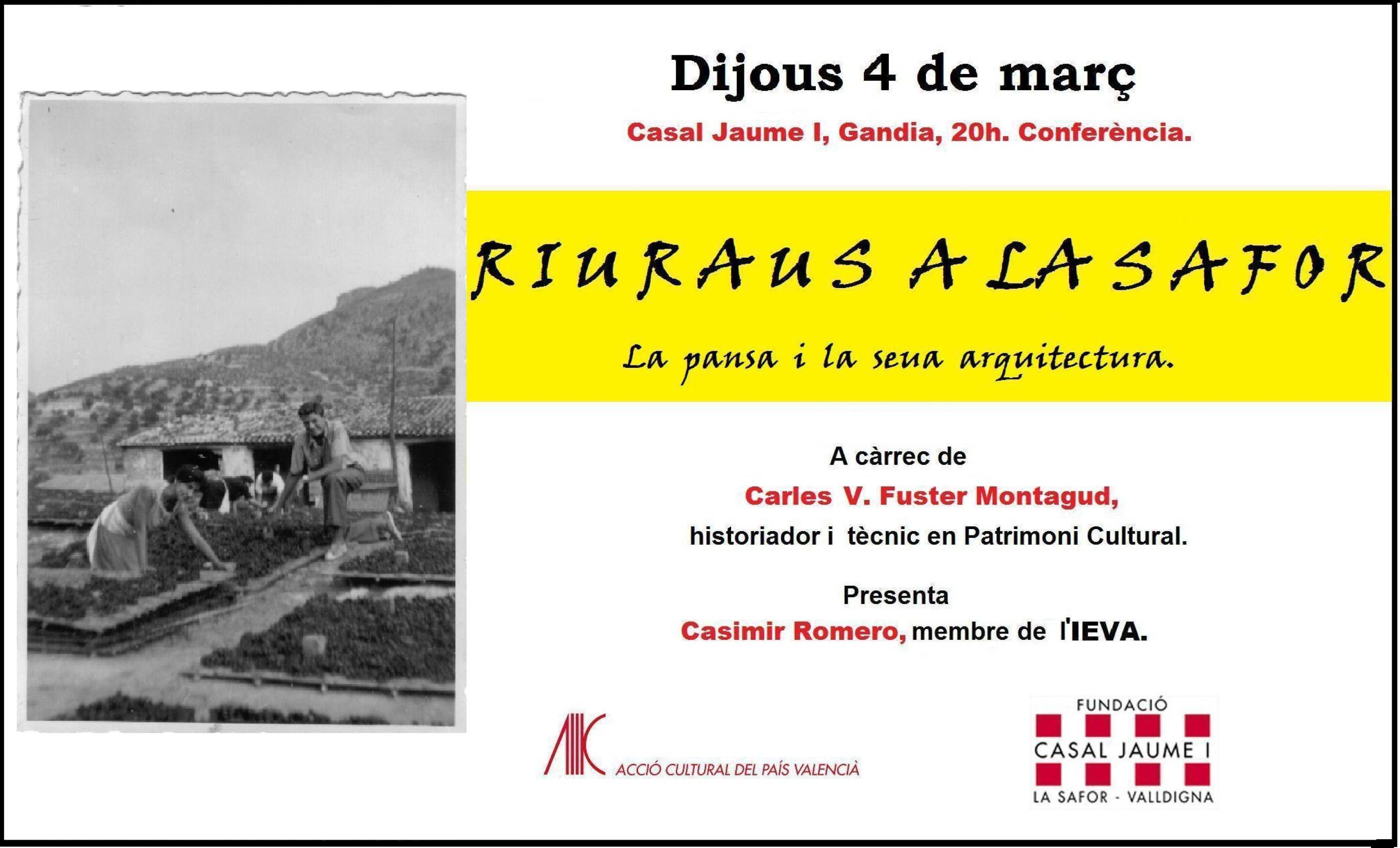 | Aquest dijous a les 20:00h en el Casal Jaume I de Gandia, conferència “L’arquitectura de la pansa, una ullada als riuraus de la comarca de La Safor – Valldigna”, a càrrec de Carlos Fuster Montagud, VOS ESPEREM. |