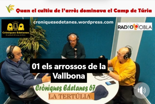Parlarem de l’arròs, un antiquíssim cultiu que vingué de la mà dels àrabs al segle XII i que va ser prohibit ala nostra comarca el 1769. El seu conreu, com tantes coses, tenia una cara molt positiva, alimentava els més pobres, i una creu negativa, perjudicava els interessos de la ciutat de València i la seua Horta… Tot i que la capital acabà guanyant la partida, els llauradors edetans van sostenir amb força una llarguíssima guerra arrossera, la qual serví també per a completar un dels sistemes de regadiu més perfectes del País Valencià. A més, la desaparició de l’arròs del Camp de Túria tingué també unes conseqüències positives, com ara el conreu de la morera i, sobretot, l’arribada posterior de la ceba, que ha perdurat fins als nostres dies…